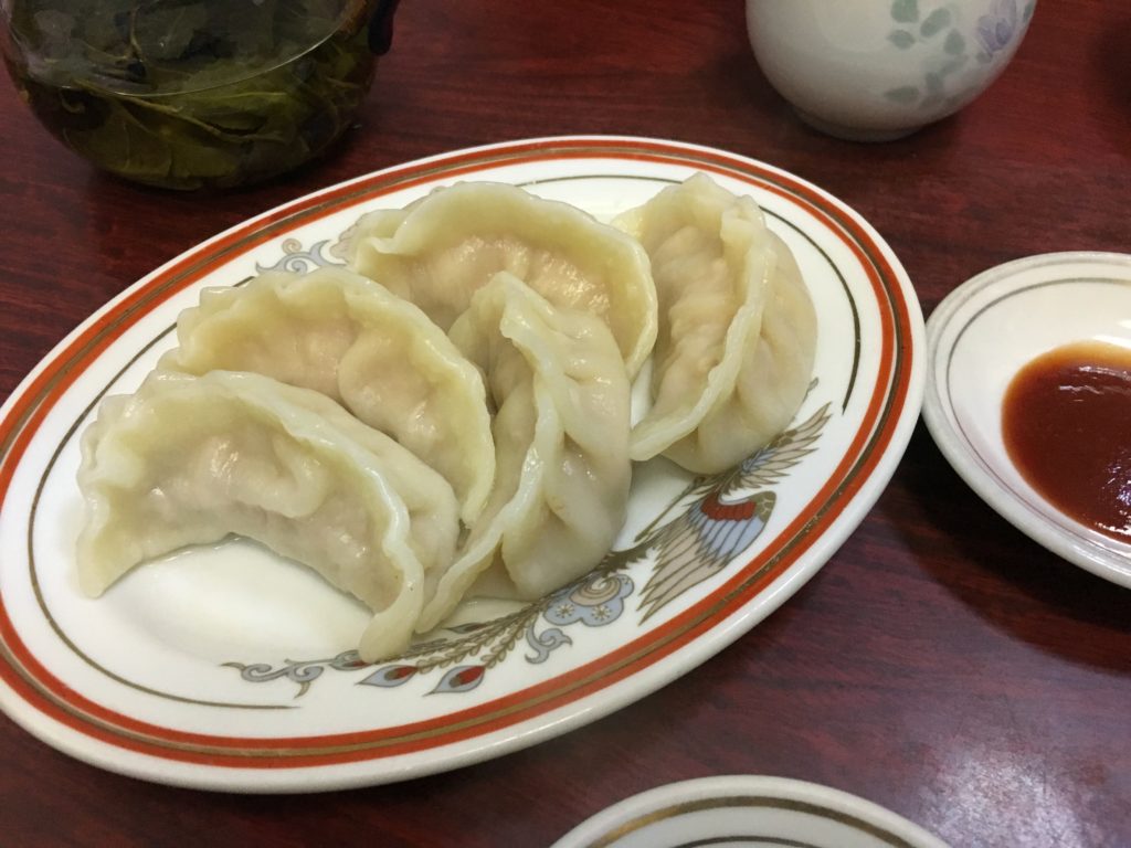 北京水餃子:刻んだネギに白菜を加えて旨味を凝縮させ、厚めの皮で包んでいる。黒酢を加えて頂く。
