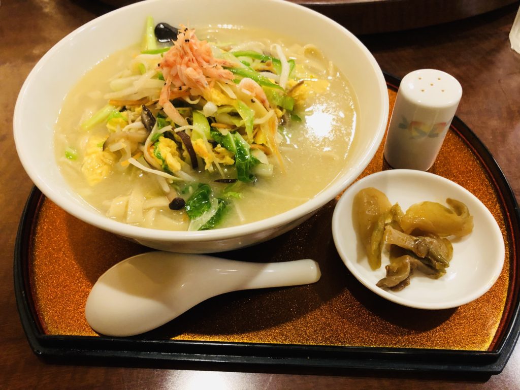 野菜入り刀削麺は女性人気高い。刀削麺ではあるが、野菜たっぷりでヘルシー。スープは鶏ガラから取ったと思われる優しいちゃんぽんの味わい。