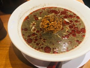 看板の坦坦麺は三河屋製麺と共同開発のオリジナル麺。スープは胡麻の濃厚風味と旨味とコクを感じる白胡麻ベース、0辛(子供向け)~5辛(激辛)で辛さの調整可能。担担麺の要の辣油は自家製、粗挽きの韓国唐辛子を含む数種類の唐辛子と香味野菜を高温の油にかける。山椒は四川省漢源県産品を店内で挽いて使用、辛さと風味を引き出す。これに粗めに引いて食感を高めたひき肉を自家製赤出汁味噌の甜面醬で炒め、スープにコクと甘みを加えている。トッピング京都産九条ねぎ、カシューナッツ、ザーサイ、干しエビ等を。オプションで排骨、揚げ味付け玉子等。