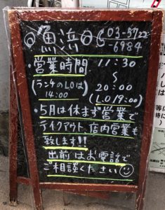 ランチ・ディナー営業。テイクアウトと距離によりデリバリーも。最新情報は電話(03-5722-6984)かInstagramで、Twitterは更新頻度少ない模様。